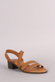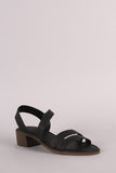 This comfy sandal features an open toe silhouette, double band across vamp, angled instep strap with partial elastic insert, block heel, and lightly padded insole for comfort.