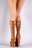 This eye-catching wedge features an open toe silhouette, strappy lace-up corset construction, and wrapped platform wedge heel. Finished with a lightly padded insole and back zip-up closure.