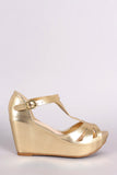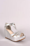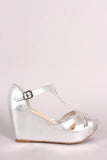 This wedge features a metallic finish, open toe silhouette, cut-out design, t-strap construction, and partially covered platform wedge heel. Finished with a lightly cushioned insole and ankle strap with adjustable buckle closure.