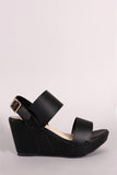 This casual wedge features an open toe silhouette, double bands across vamp, slingback with side buckle closure, and studded side accent. Finished with a lightly padded insole and partially hidden platform wedge heel.