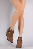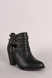 These fashion-forward ankle boots feature an almond toe silhouette, side cutout designs with triple buckle straps detail, and chunky stacked heel. Finished with cushioned insole and convenient back-zip closure.