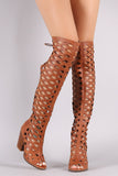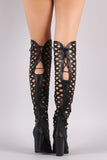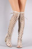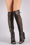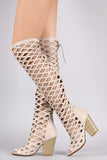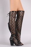 These fashionable over-the-knee boots feature a diamond cutout design, peep toe silhouette, chunky stacked heel, and cushioned insole for comfort. Finished with back zipper and partial lace-up closure.