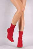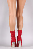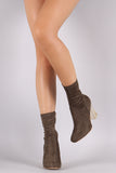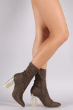 These boots feature vegan suede fabrication, slim ankle fit, side zipper for easy onoff, and a clear chunky heel.