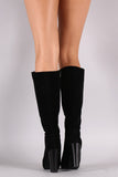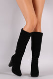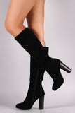 This knee high boots features a lightly padded vegan suede fabrication, zip-up closure, almond toe silhouette. Finished with a stacked chunky heel and lightly padded insole.