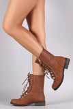 These trendy combat boots feature a slightly padded vegan leather upper, faux metal zipper detail, round toe silhouette, low heel, and cushioned insole for comfort. Finished with a lace-up front.