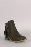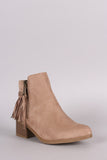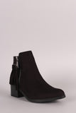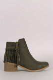 These stylish booties feature a soft vegan suede upper with back fringe detail, decorative zipper trim at side, almond toe silhouette, and stacked block heel. Finished with a cushioned insole, smooth lining, and side zipper closure for easy on/off.