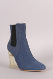 These ankle boots feature a denim upper, elastic gore inset, and chunky lucite heel. Finished with a cushioned insole, smooth lining, and side zipper closure for easy on/off.