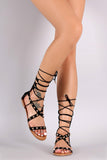 This flat sandal features a prism-studded crisscross vamp, open toe silhouette, and strappy lace-up construction. Finished with a rear zipper fastener and lightly padded insole for comfort.