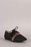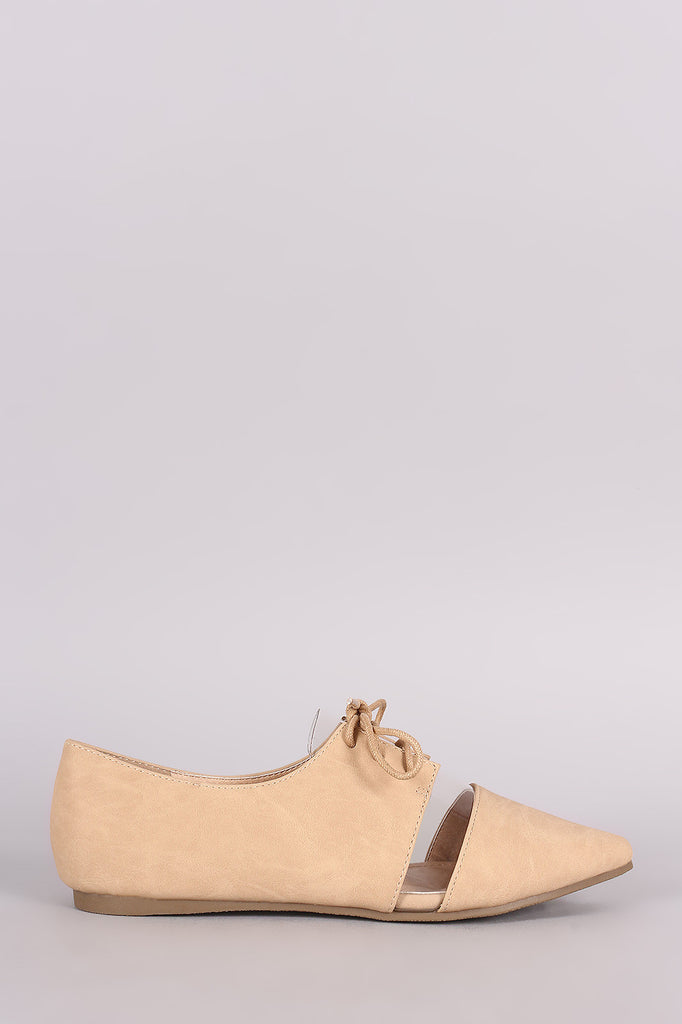 This simply stylish pointy toe silhouette, lucite inset design, lace up closure, and lightly padded insole.
