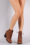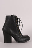 These stylish  ankle boots  feature a round toe silhouette, stitching accents, and chunky faux wooden heel. Finished with a cushioned insole, smooth lining, and lace up front closure.
