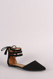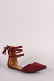 This lovely  flat  features a pointy toe silhouette, triple ankle straps with side lace-up detail, open shank, lightly cushioned insole, and rear zipper closure for easy on/off.