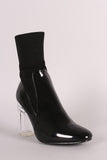 These edgy  ankle boots  feature a chunky lucite heel, soft vegan suede shaft with a wide elasticized cuff, cushioned insole, soft faux fur lining, and side zipper closure for easy on/off.