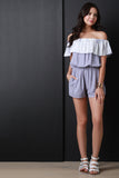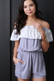 This cute off the shoulder romper features an elasticized ruffled neckline, short sleeves and a tie dye fabrication. Finished with an elasticized waistline and two front pockets. Accessories sold separately. Made in U.S.A. 100% Rayon.