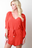 This romper features a v-neckline, self-tie bow at nape, short butterfly sleeves, drawstring waist with seashell charm, and flutter shorts. Accessories sold separately. 100% Rayon.