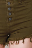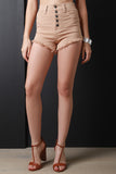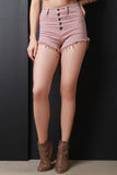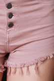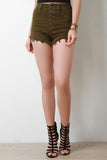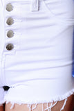 These high waist denim shorts features a distressed hem, faux front pockets, classic patch back pockets, belt loops, 5 button closure. Accessories sold separately. Made in U.S.A. 98 % Cotton, 2% Spandex.