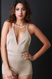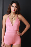 This backless romper features a deep v-neckline, spaghetti shoulder straps to a crisscross back, high waisted wide panel cinched seam, and shorts bottom half. Accessories sold separately. Made in U.S.A. 95% Polyester, 5% Spandex.