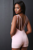 This cute romper features an open back design, deep v neckline, textured knit fabrication, finished with a self lining. Accessories sold separately. Made in U.S.A. 95% Polyester 5% Spandex.