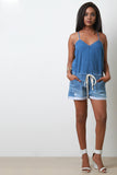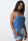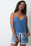This faded denim cami romper features a v neckline with an adjustable spaghetti straps, crisscrossing back, and self-tie drawstring at waist. Finished with two front/back patched pockets and cuffed raw-edge hemline. Accessories sold separately. 85% Cotton, 13% Polyester, 2% Spandex.