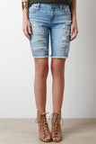These denim Bermuda shorts feature a classic 5-pocket design, distressed details, faded worn in wash, finished with a frayed hem. Accessories sold separately 99% Cotton 1% Spandex.