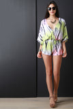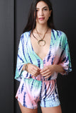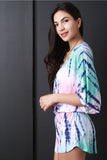 This cute romper features a deep v surplice neckline, soft knit fabrication, tie dye coloring, dolman sleeves, elastic waist, and rounded hem shorts. Accessories sold separately. Made in U.S.A. 95% Rayon, 5% Spandex.