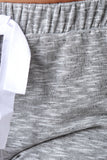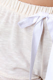 These sporty shorts feature a marled knit fabrication with contrasting fishnet hemline, wide elasticized waist band with self-tie ribbon detail, and high waisted fit. Accessories sold separately. Made in U.S.A. Self: 80% Rayon, 17% Polyester, 3% Spandex. Contrast: 95% Polyester, 5% Spandex.