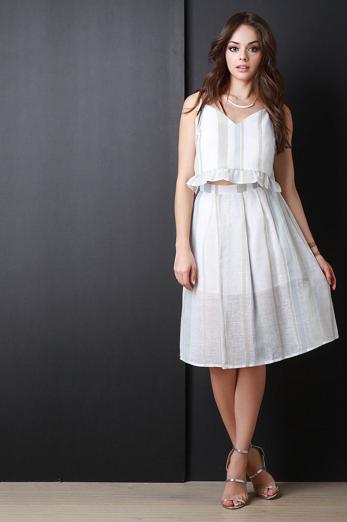 This lightweight midi skirt features semi-sheer striped fabric, pleated design, a-line cut, hidden back zipper closure, and partial lining. Accessories sold separately. Self: 80% Polyester, 20% Cotton. Lining: 97% Polyester, 3% Spandex.