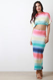 This maxi skirt features tie dye jersey knit, ruched back, and slit. Accessories sold separately. 96% Rayon, 4% Spandex.