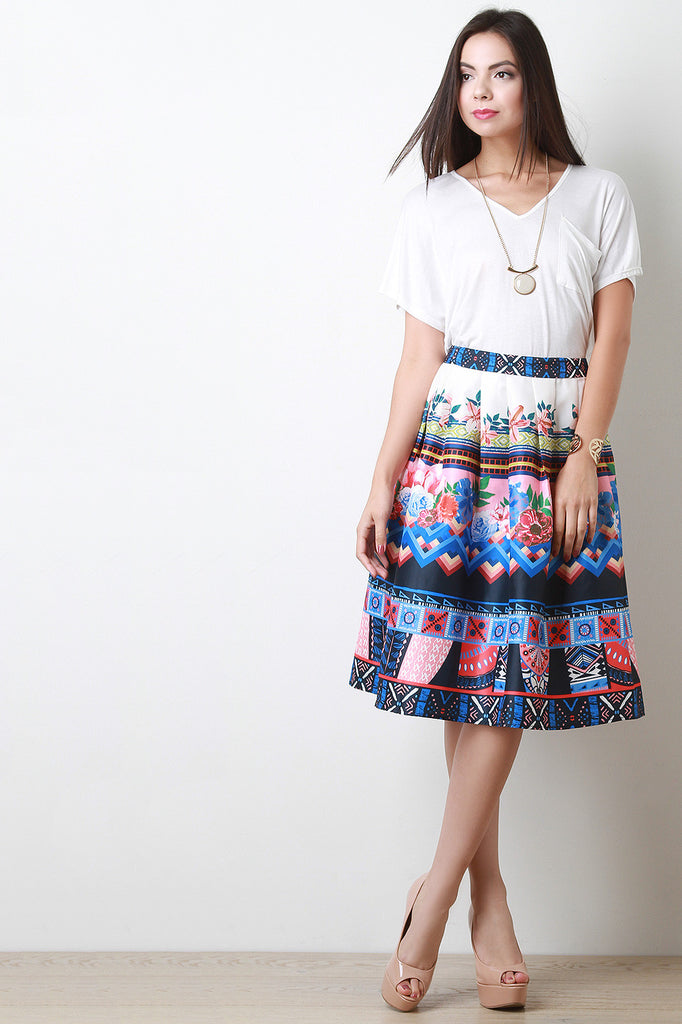 This A-line skirt features a wide high waist band with hidden zipper fastener at side, box pleating, finish with floral and bohemian pattern print. Accessories sold separately. 100% Polyester.
