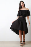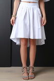 This chic midi skirt features a woven fabrication, high waist, self tie bow. pleated detail, high low hem line and a back zipper closure. Accessories sold separately. Made in U.S.A. 92% Cotton, 8% Spandex.