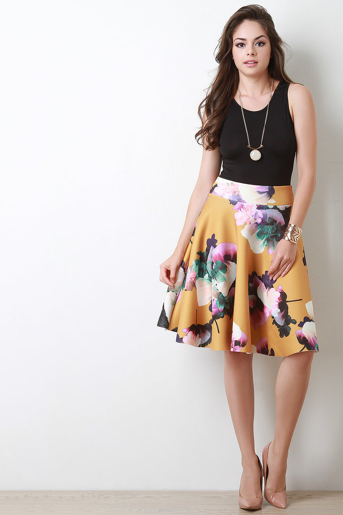 This midi skirt features a knit neoprene fabrication, multi colored floral print pattern, wide waistband, a line skirt silhouette and a raw hemline. Accessories sold separately. Made in U.S.A. 95%Polyester, 5% Spandex.