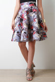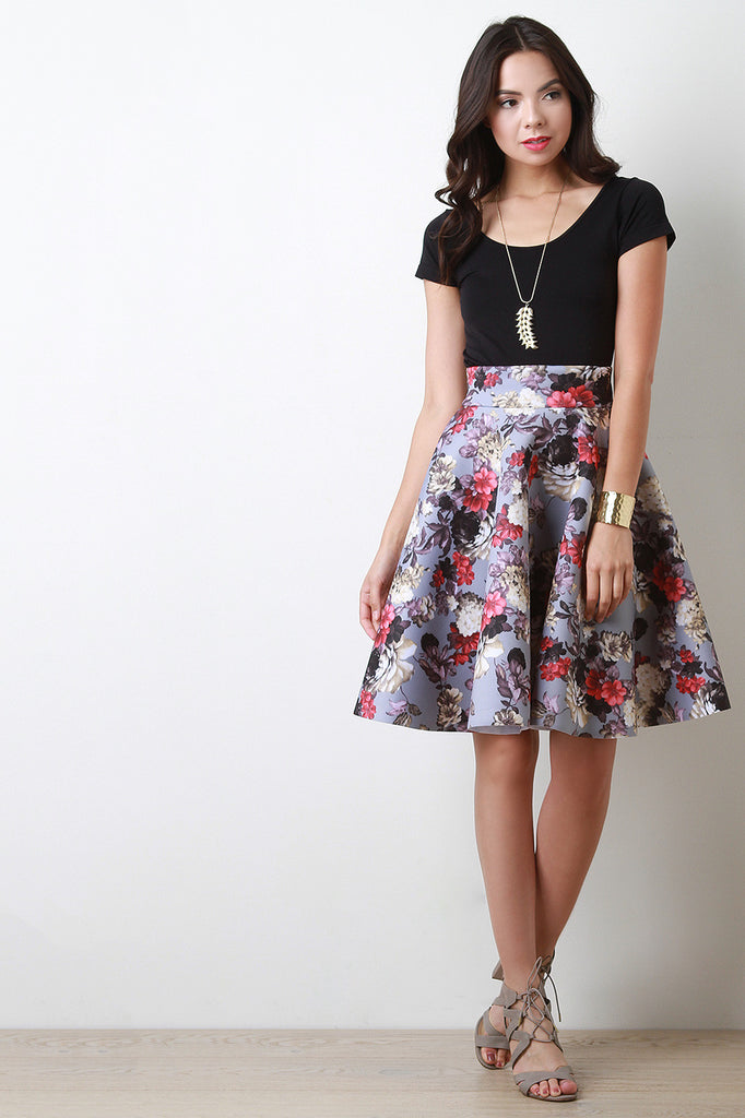 This midi skirt features a thick knit neoprene fabrication, all over floral print pattern, wide waistband, back zipper closure, a line skirt silhouette and a raw hemline. Accessories sold separately. Made in U.S.A. 95%Polyester, 5% Spandex.