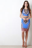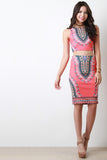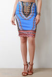 This skirt features smooth stretch fabric, African tribal print, elasticized waist, pencil cut, and midi length. Accessories sold separately. Made in USA. 92% Polyester, 8% Spandex.