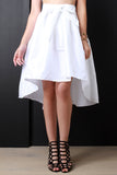 This chic skirt features a crisp knit fabrication, wide waistband with front self-tie bow detail, and taffeta pleated construction. Finished with a high-low hemline and hidden side zip-up closure. Accessories sold separately. 95% Polyester, 5% Spandex.