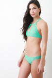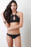 This bikini features a halter like construction, keyhole front, removable padded cups, T-strap macram� back, low rise bikini bottom, cheeky back, strappy macram� sides, and fully lined. Accessories sold separately. 82% Polyamid, 18% Elastan. Lining: 100% Polyester.