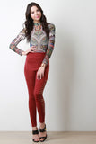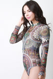 This bodysuit features a mock neckline, long sleeves, brief bottom, double snap button closure at crotch, and graphic pattern print on semi-sheer mesh fabrication. Accessories sold separately. Made in U.S.A. 100% Polyester.