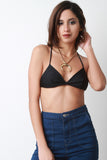 This bralette top features a triangle top front, spaghetti shoulder straps, and a caged racerback. Accessories sold separately. Made in U.S.A. 96% Polyester, 4% Spandex.