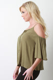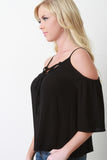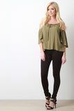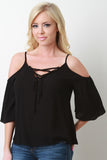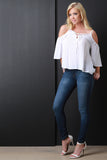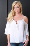 This bohemian top features open shoulders with short bell sleeves, v-neckline with a corset lace up and a relaxed fit with a straight hemline. Accessories sold separately. 100% Rayon.