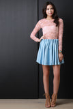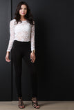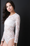 This bodysuit features a semi-sheer floral lace fabrication, round neckline, long sleeves, brief bottom, and finished with a double snap button at crotch. Made in U.S.A. 96% Polyester, 4% Spandex.