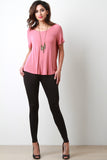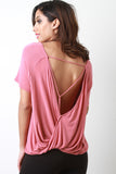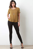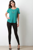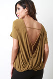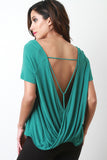 This soft knit top features a round neckline, short sleeves, surplice back and a triangle caged back accent. Accessories sold separately. 96% Rayon, 4% Spandex.