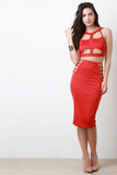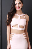 This chic top features a mock neckline, cut-out panel details, open midriff, and sleeveless construction. Finished with an open back, rear zip-up closure, and cropped hemline. Accessories sold separately. Made in U.S.A. 96% Polyester, 4% Spandex.