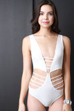 This flirty bodysuit features stretch fabric, plunge neck, cut out panels, strappy caged design, deep scooped back, and double snap button closure at crotch for easy on/off. Accessories sold separately. 95% Polyester, 5% Spandex.
