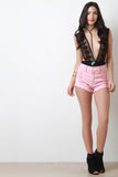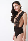 This bodysuit features a deep v-neckline, floral embroider semi-sheer mesh fabrication with scallop trimming, self-tie bow at nape, high waisted seam to a contrasting brief bottom, and double snap button closure at nape. Accessories sold separately. Made in U.S.A. 95% Polyester, 5% Spandex.