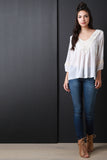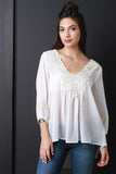 This charming peasant crochet lace insets, crochet lace at yoke, and high-low hem. Accessories sold separately. Made in U.S.A. 100% Polyester, Contrast: 96% Rayon, 4% Spandex.