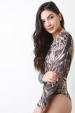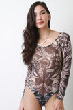 This bodysuit features a semi-sheer mesh fabrication, colorful abstract print pattern, round neckline, long sleeve construction, and low cutback with bikini style bottom. Accessories sold separately. Made in U.S.A. 100% Polyester.