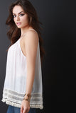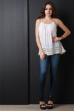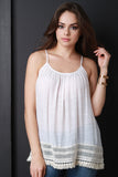 This cute sleeveless top features a scoop neckline, spaghetti straps, loose relaxed fit, light weight woven fabrication, finished with a crochet fringe trim hem. Accessories sold separately. Made in U.S.A. 65% Rayon 35% Polyester.