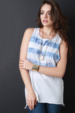 This tank top features an over-sized fit, soft knit fabrication, tie dye detail, gathered racerback, finished with raw hems. Accessories sold separately. Made in U.S.A. 100% Cotton.