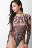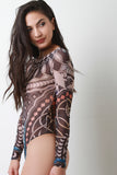 This mesh fabrication, colorful abstract print pattern, round high neckline, long sleeve construction, and low bikini style bottom with a double snap closure at crotch. Accessories sold separately. Made in U.S.A. 92% Polyester, 8% Spandex.