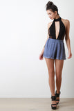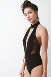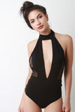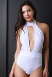 This bodysuit features smooth stretch knit, contrast semi-sheer mesh, mock neck with double button closure at nape, front cut out, and open back. Finished with double snap button closure at crotch for easy on/off. Accessories sold separately. Made in U.S.A. 95% Polyester, 5% Spandex.
