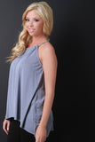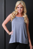 This cute sleeveless top features a soft knit fabrication, tie back spaghetti straps, high ruffle neckline, back key hole, billowy flare cut, finished with a raw hemline. Accessories sold separately. Made in U.S.A. 75% Modal, 25% Polyester.