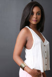 This casual top features lightweight knit, deep v-neckline, button-up front, racer back, and relaxed fit. Accessories sold separately. Made in U.S.A. 85% Rayon, 15% Linen.